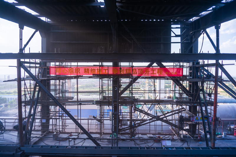 工程中鋼結(jié)構(gòu)框架位于煉鋼廠房最頂層的復(fù)雜環(huán)境,加上煉鋼廠房各層不停產(chǎn),交叉作業(yè)較多,現(xiàn)場溫度高,工作難度非常大。為了確保頂升順利實(shí)施,公司領(lǐng)導(dǎo)對可能遇到的困難高度關(guān)注,從方案討論、圖紙?jiān)O(shè)計(jì)、到施工組織每一步都精心控制。董事長高作平教授親自指導(dǎo)工作,指出鋼滑道頂升既有建筑物是巨成的獨(dú)創(chuàng)核心科技,本工程是該技術(shù)的創(chuàng)新應(yīng)用,務(wù)必做到安全可靠,為鋼滑道頂升既有建筑物規(guī)程的編制積累數(shù)據(jù)。公司派出了強(qiáng)大的設(shè)計(jì)和安全團(tuán)隊(duì)為現(xiàn)場提供有力的技術(shù)支持。在第一個(gè)頂升日中,原計(jì)劃需耗時(shí)一整天頂升量60公分的工作,僅僅用時(shí)兩個(gè)小時(shí)就順利完成。超出了所有人的預(yù)期,獲得了業(yè)主、監(jiān)理等各方的喝彩。頂升工程最關(guān)鍵的是安全問題,項(xiàng)目組在接下來的工作中穩(wěn)扎穩(wěn)打,不畏辛勞,乘勝追擊,在頂升間歇期做好所有焊接和安全工作,至6.1日按計(jì)劃順利完工。