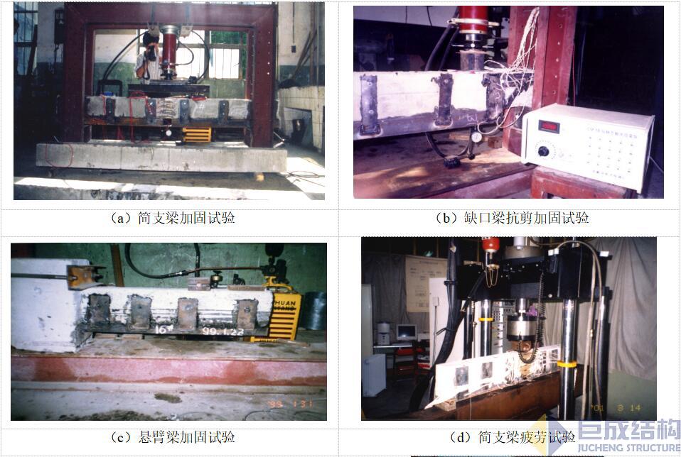 二十年來,巨成結(jié)構(gòu)科研人員對粘接型鋼加大截面加固法開展了相關(guān)理論分析、力學(xué)性能試驗研究和數(shù)值分析,包括粘接型鋼加大截面加固簡支梁抗彎試驗研究、粘接型鋼加大截面加固缺口梁端部抗剪試驗研究、粘接型鋼加大截面加固懸挑梁抗彎試驗研究、粘接型鋼加大截面加固簡支梁重載疲勞試驗研究、粘接型鋼加固混凝土板試驗研究等(如圖4),取得了豐富的研究成果,具有理論、試驗研究分析和大量實際應(yīng)用基礎(chǔ)。