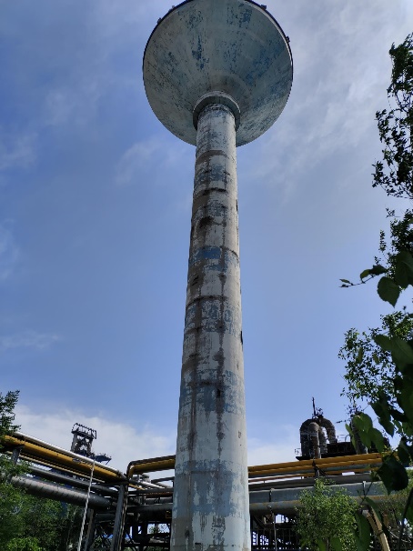 新疆天山鋼鐵巴州有限公司簡稱“巴州鋼鐵”,巴州鋼鐵煉鋼廠內(nèi)有一座事故水塔。水塔為鋼筋混凝土筒體結(jié)構(gòu),上部主要是倒錐形水箱,水箱檐口直徑14.62米,下部為圓柱形支筒,支筒外徑3.22米,水塔頂高度為43.08米。該水塔建于2011年,歷經(jīng)10余年的風(fēng)吹雨打、酷暑嚴(yán)寒,水塔主體結(jié)構(gòu)有多處老化和損傷,橫豎裂縫總長達(dá)187米之多。水塔成為鋼鐵廠的高危建筑,加固水塔成為巴州鋼鐵的一件心頭大事。